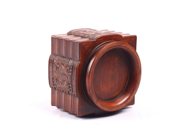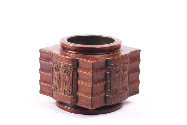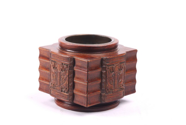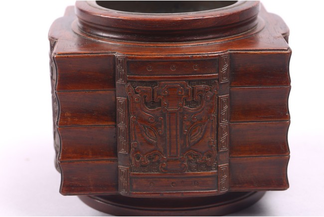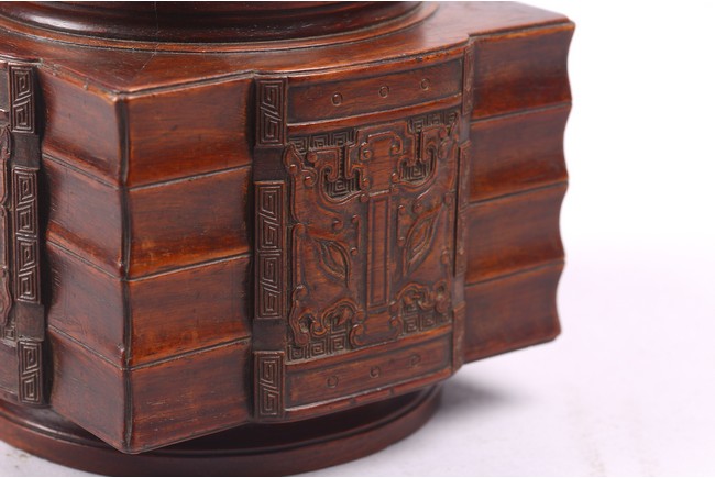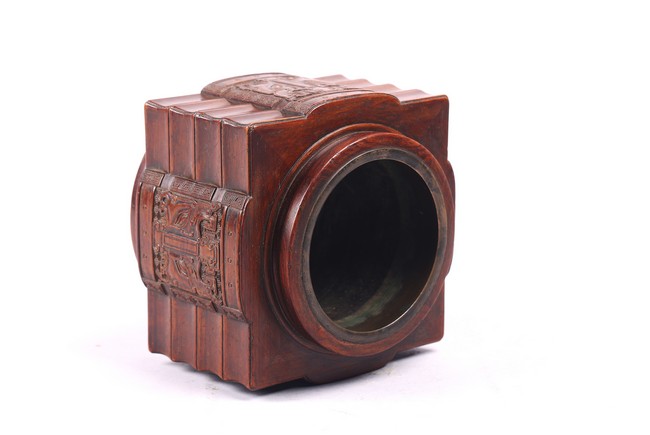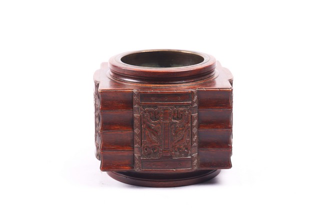 Of cylindrical form with square projections on four sides, divided into three registers and the center raised panel carved in shallow relief with stylized taotie mask, the interior carved out with copper lining.Qing Dynasty period.