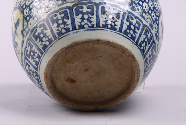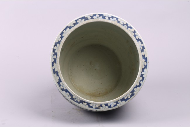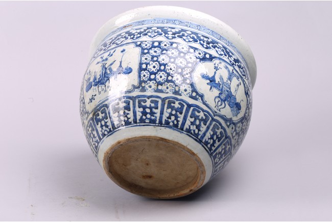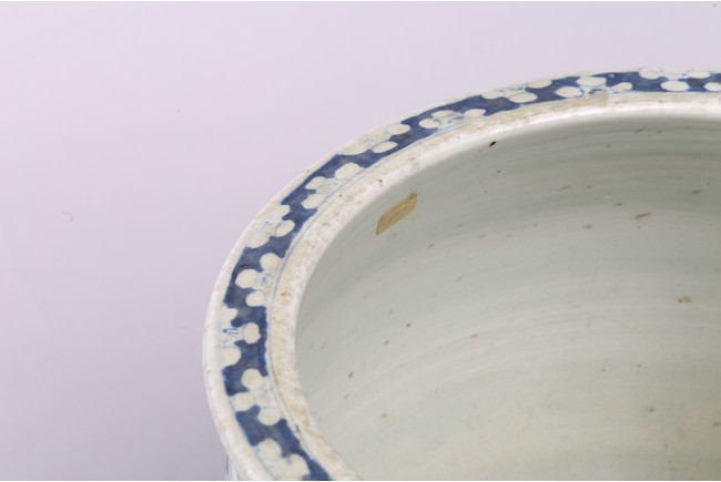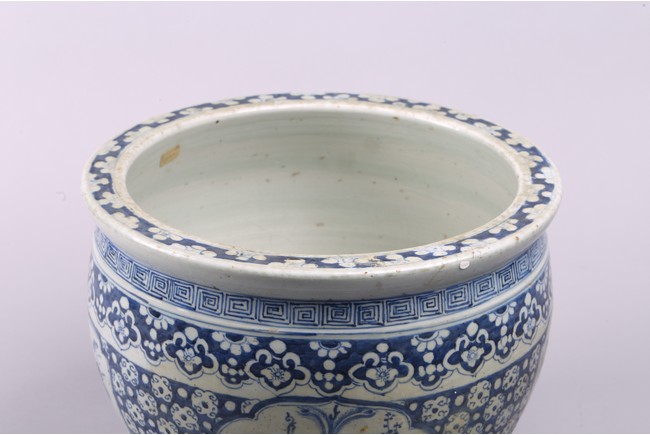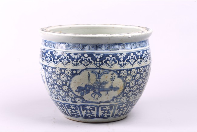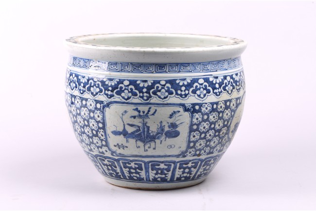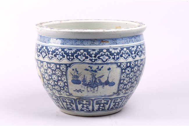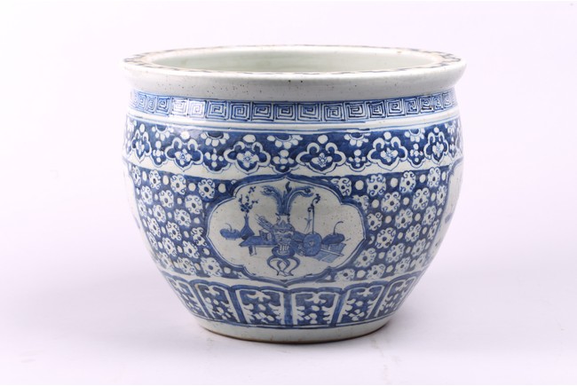 The large jardiniere decorated with panels enclosing bogu pattern around the exterior amidst scrolling motifs. Qing Dynasty period.