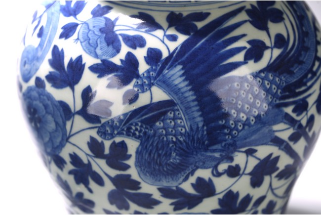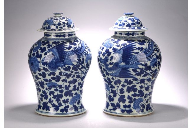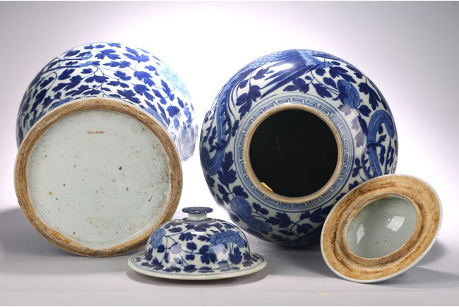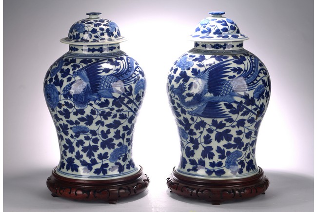 Each painted in cobalt-blue tones with phoenix traveling through leafy peony scrolls, all between key-fret band and a double line, the domed cover similarly decorated with peony decoration. Hardwood stands. Qing Dynasty period.
