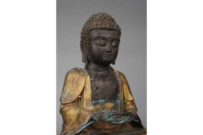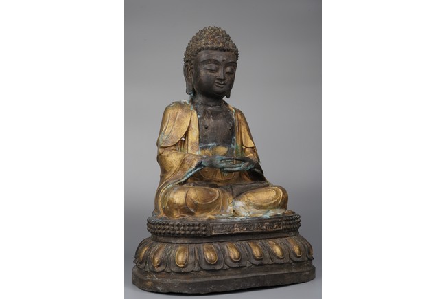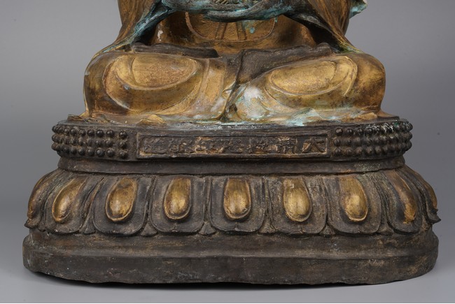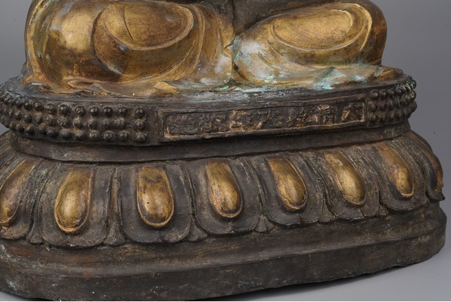 Chinese. cast seated on lotus throne cast to the front with Qianlong reign mark, the hands in dhyana mudra, the dhoti sashed at the waist, the bowed head with a serene expression, downcast eyes, elongated ears, and tightly coiled hair.