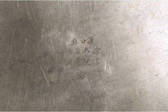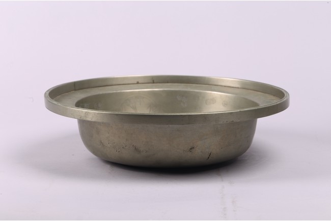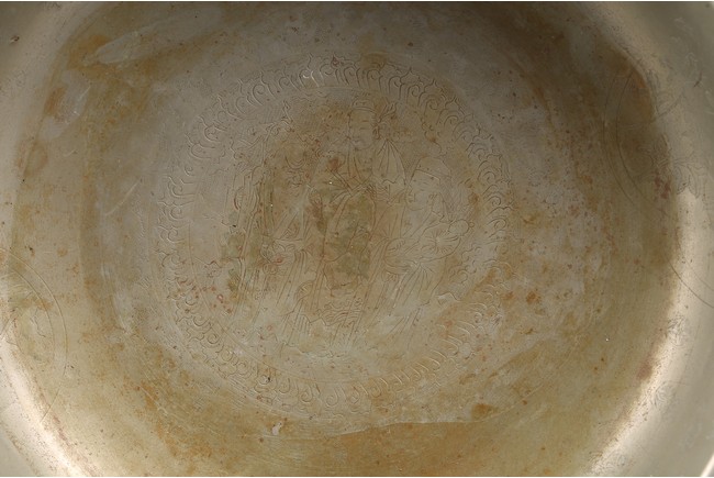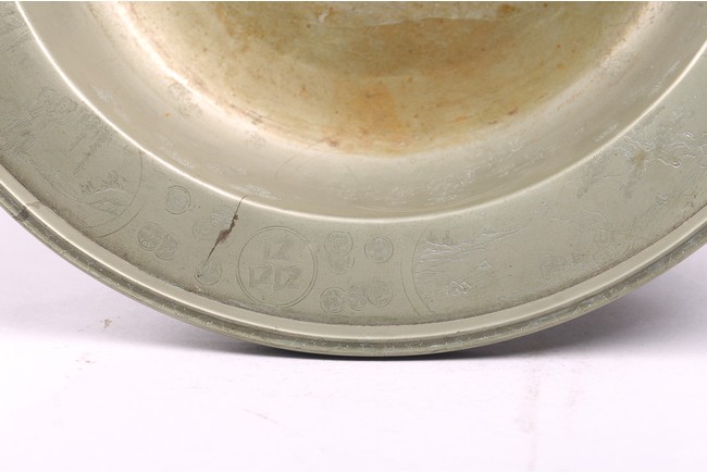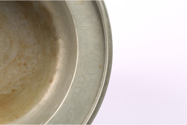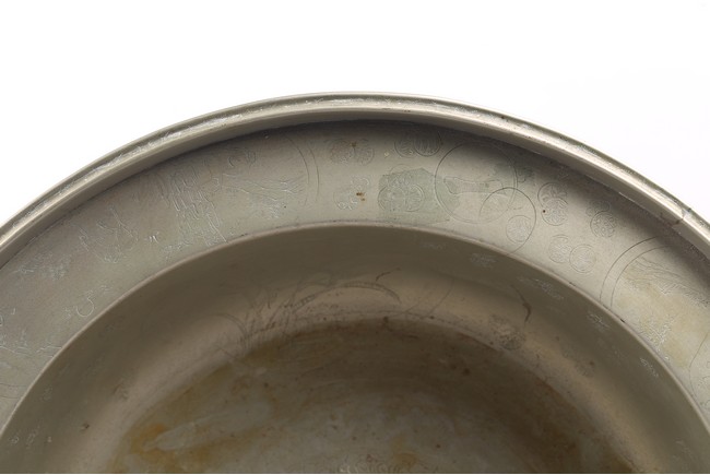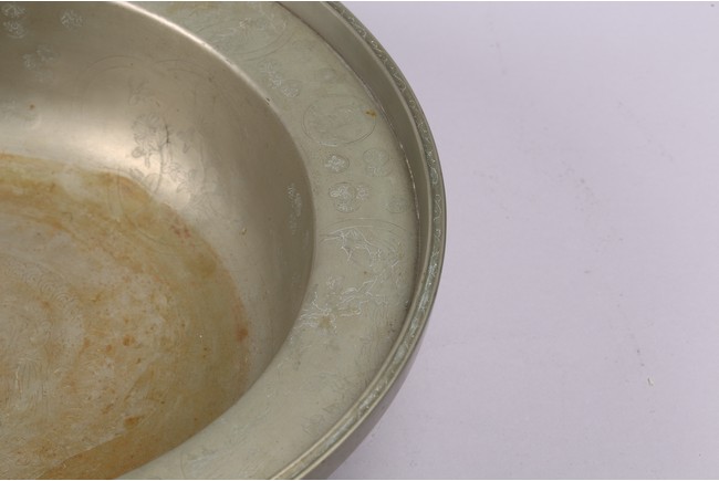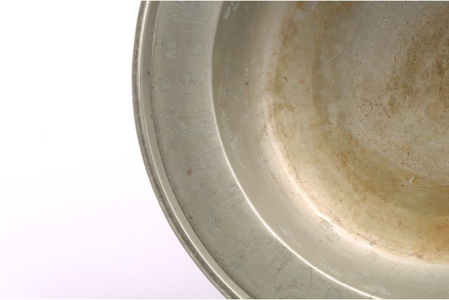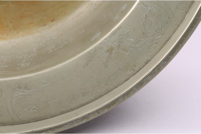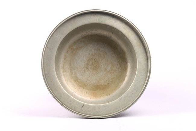 The basin with deep sides and everted mouth rim is incised at the center with three auspicious gods and characters at the rim. The base incised with twelve characters. Republic period.