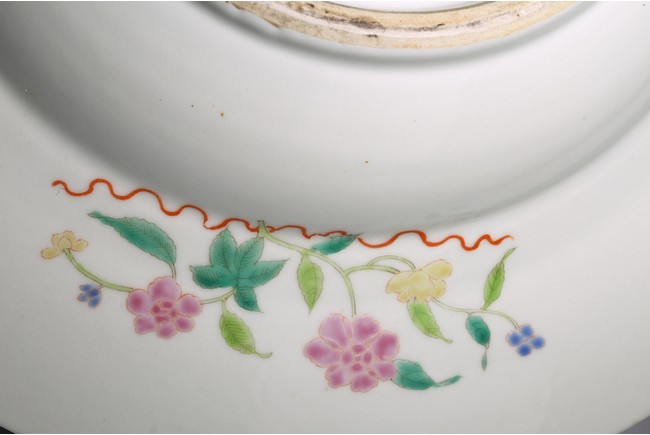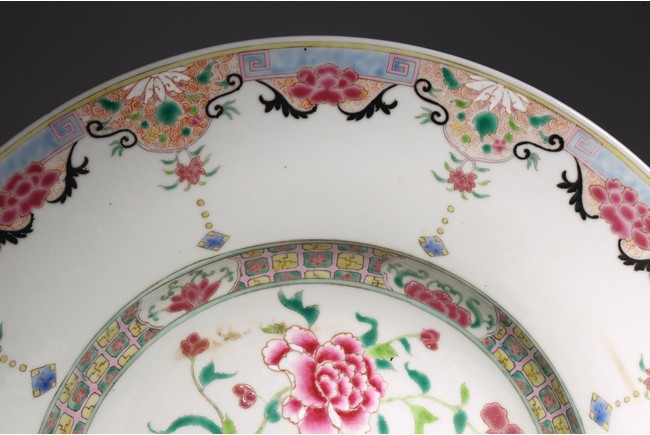 Enameled to the center with a large blooms of peony and birds perching on rockwork , the rim with further floral scrollwork, the base inscribed with Yongzheng mark. Qing Dynasty period.