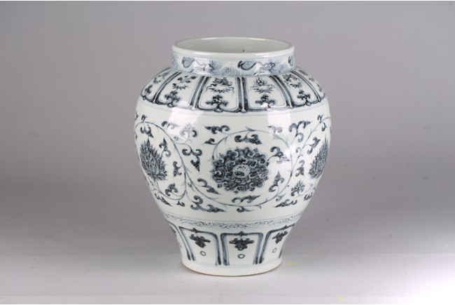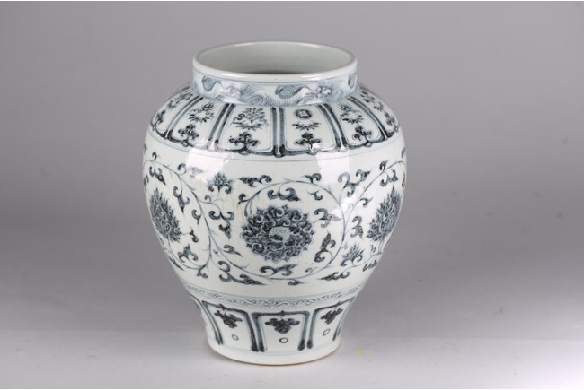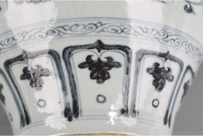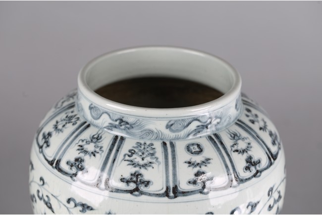 Painted around the body with a band of floral scroll below a border of pendant ruyi and borders of lappets encircling the foot and rim, base unglazed.