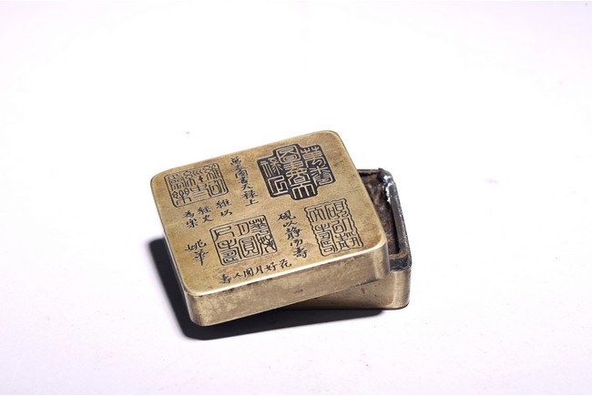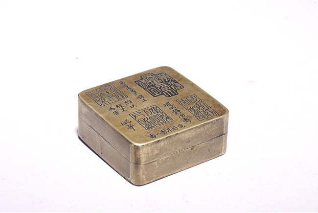 A CHINESE BRONZE SQUARE SEAL PASTE BOX 清或以後 銅印文書法印泥蓋盒