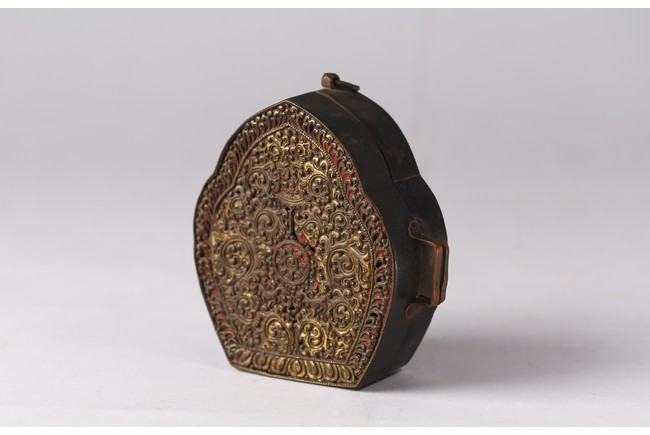 The Tibetan gau box is employed by Tibetan Buddhists to contain religious relics, historically used to protect pilgrims during their travels and to serve as a portable shrine. The central window allows the precious objects inside to be viewed while protected. 18/19th century.