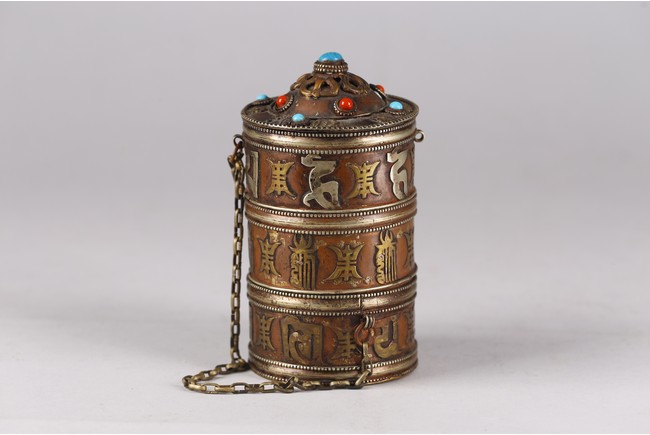 The cylindrical box modelled in form of prayer wheel with Tibetan and Chinese characters, the box cover inlaid with turquoise and coral like beads.
