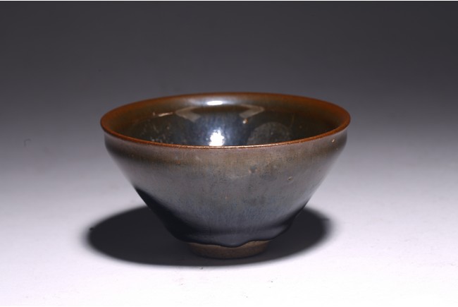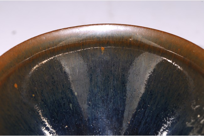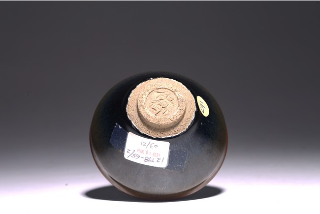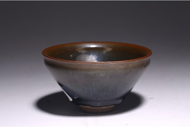 The interior and exterior of the bowl are covered with black glaze streaked with light brown 'hare’s fur’ markings, thinning to a russet-brown tone at the rim and pooling irregularly above the foot. The base inscribed with two characters. Qing Dynasty period.