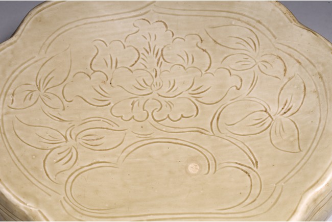 With a sloping, slightly concave top, the cream slip carved away to the buff pottery with peonies and leaves, covered in a clear glaze stopping short of the flat base. Song Dynasty period.