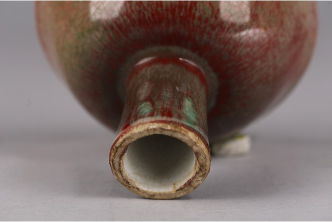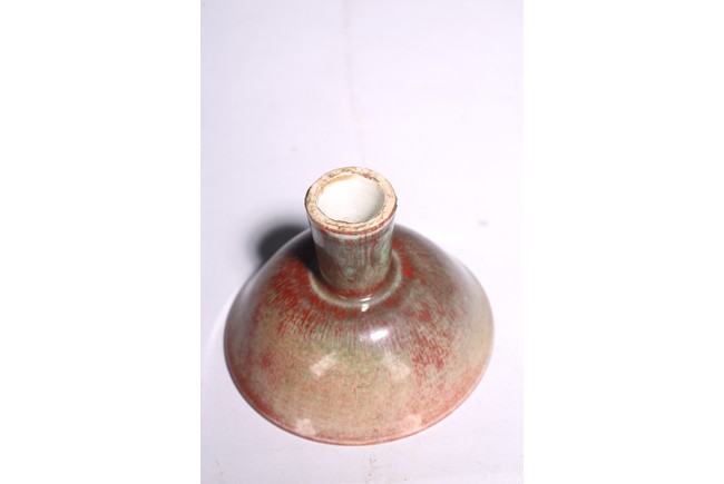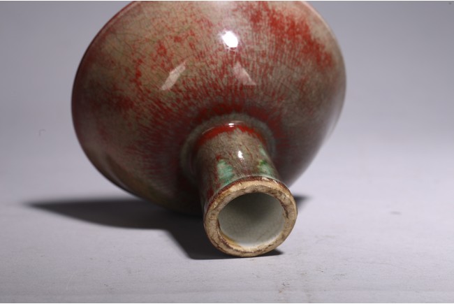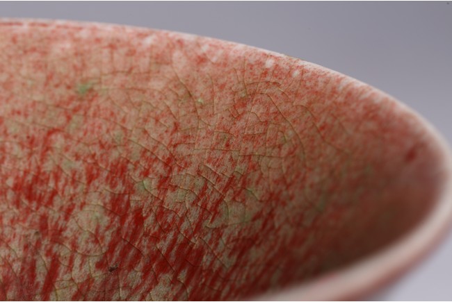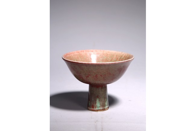 The deep cup with rounded sides raised on a spreading stem, overall suffused with crimson tone with an attractive mottling of lighter pink and green shades. Qing Dynasty period.