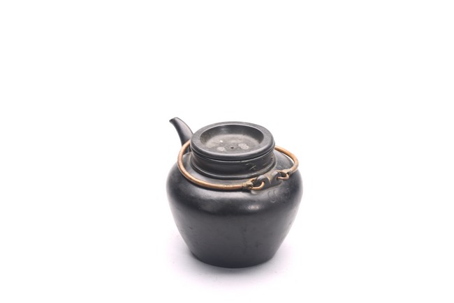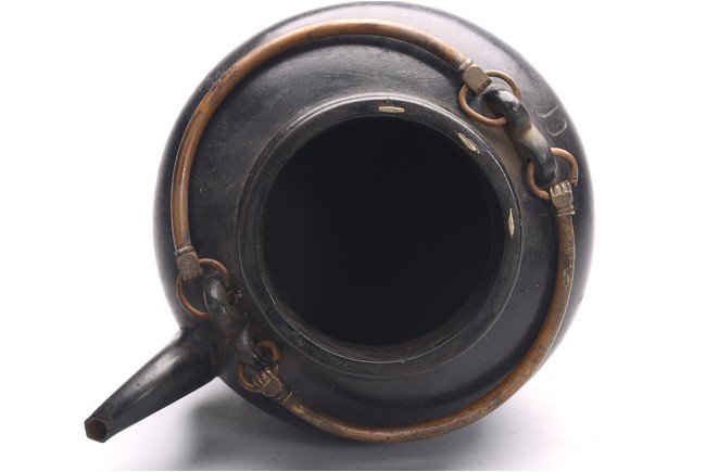 Of tapering ovoid form with two copper bail handles and the pierced cover with two double gourd stamps 'Yufeng', a square shop seal with 'Yufeng' in both Chinese and Manchurian on the base, and a two-character 'ting sheng' seal on the shoulder. Circa 1910.