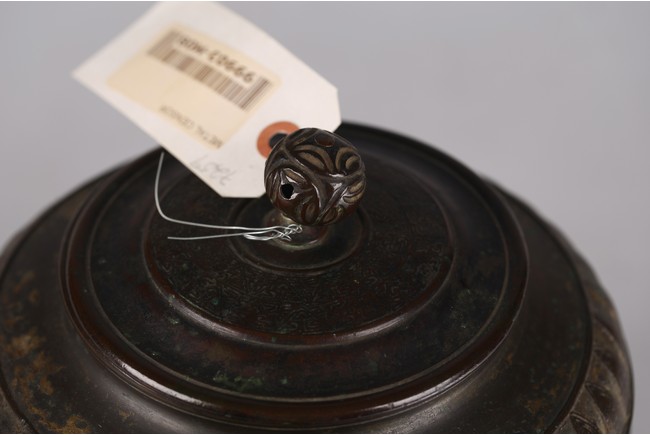 The globular body is decorated with band of stylized archaistic dragons on key-fret pattern, set with pair of ring handles, fitted with cover. Ming Dynasty period.