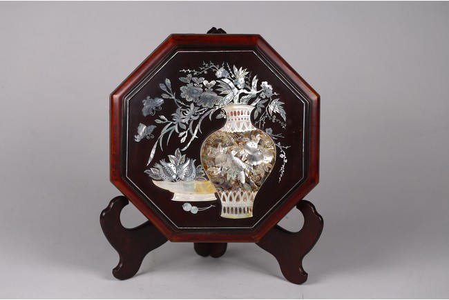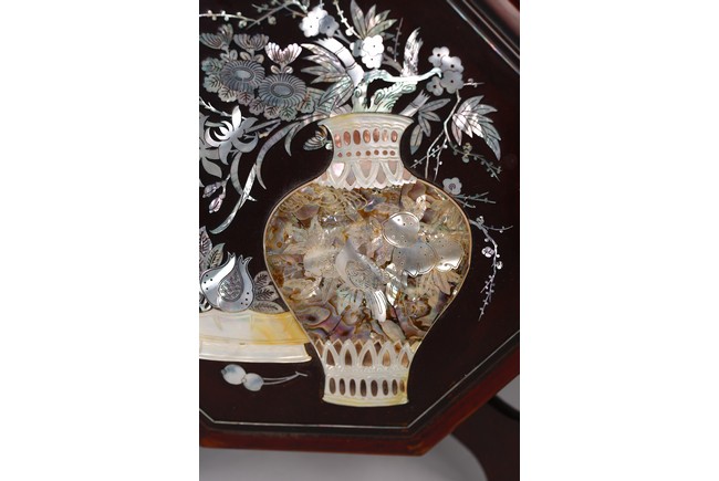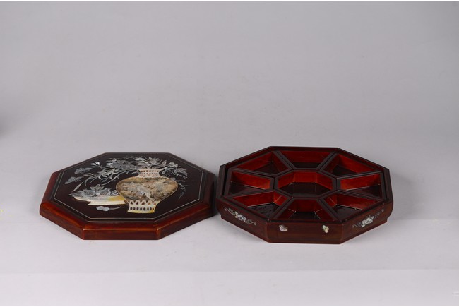 A Mother of Pearl Inlaid Lacquer Box. Inlaid with mother of pearl to depict a flower vase and dish.