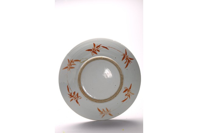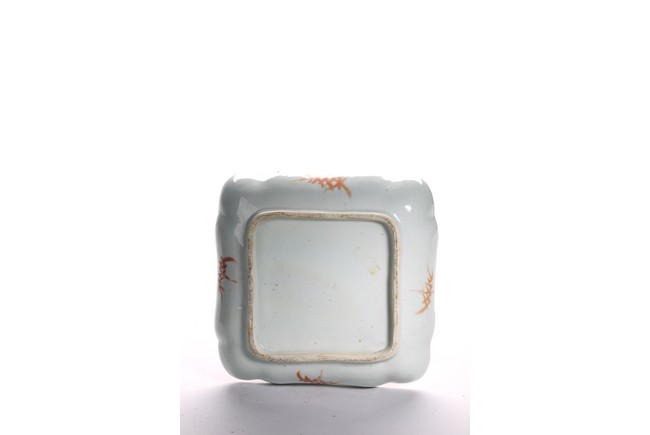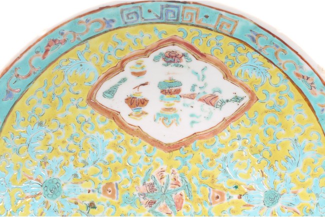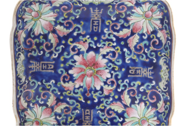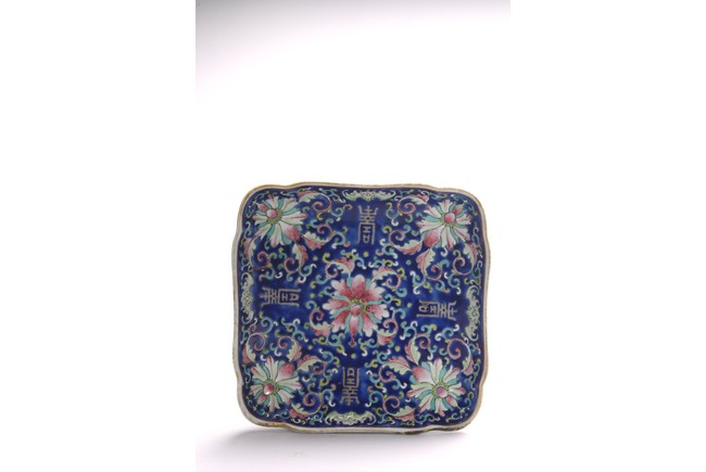 Comprising of a square famille rose dish decorated with lotus and stylized shou characters; and a circular dish decorated with antiques. Republic period.
