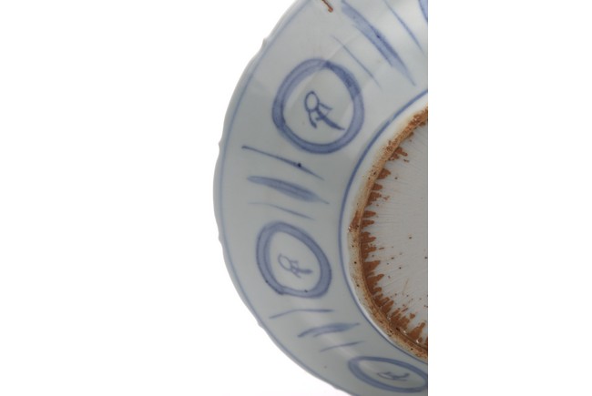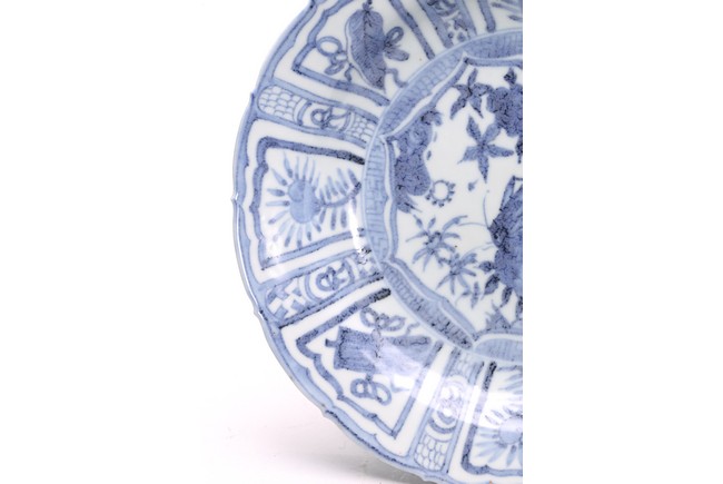 Decorated with mantis resting on rockwork to the center, the rim painted with panels of buddhist symbols. Qing Dynasty period.