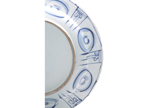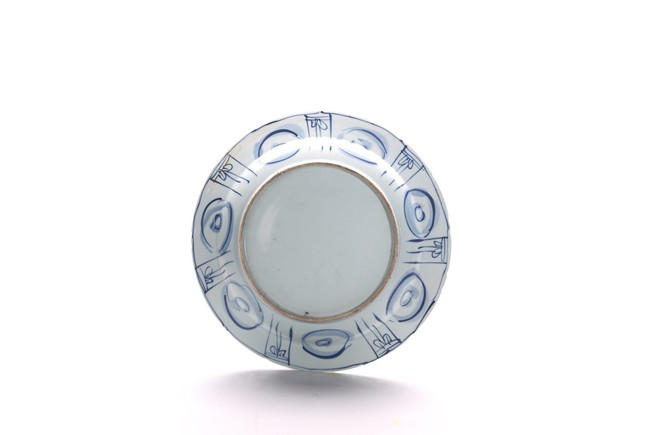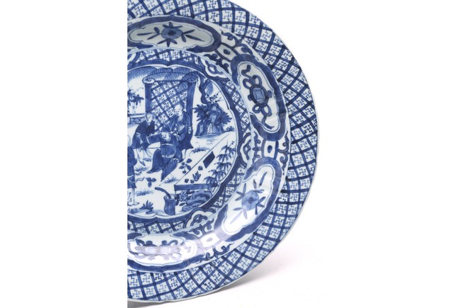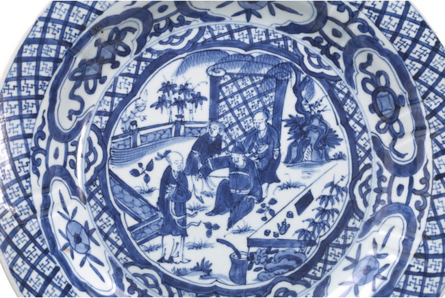 Decorated with figural story to the center, the sloped interior side painted with panels enclosing buddhist symbols and pomegranates. Qing Dynasty period.