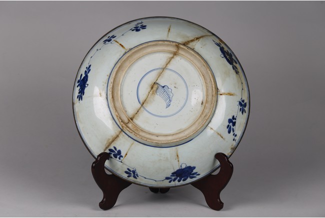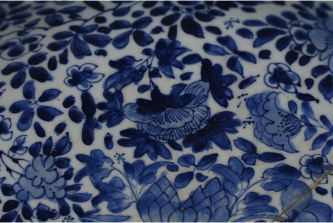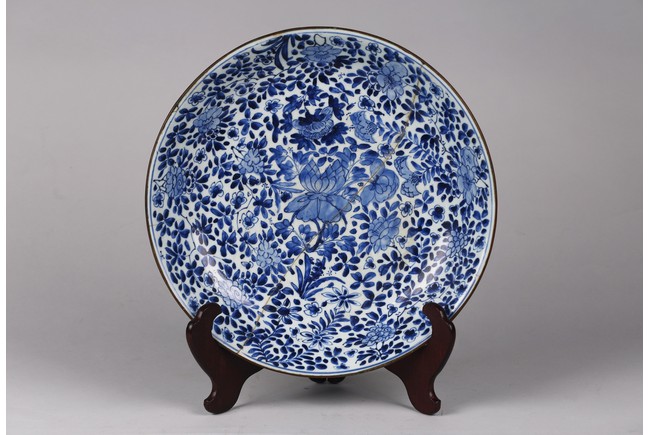 Painted all over with scrolling peony and lotus flowers. The base bears a leaf mark. Qing Dynasty period.