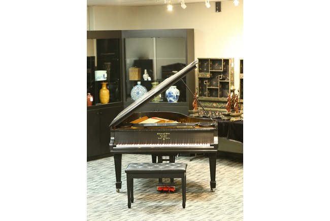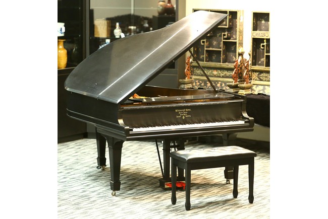 "Circa 1905. Steinway Parlor Grand Piano, model "O", serial number 114934, marked on harp and under case, harp reads "Pat. Dec. 20, 1859, May 28, 1872 # 11/11/04," foot pedal reads "4103, March 31, 1885," 5' 7", fully restored to playing condition in 2010, case has a small crack in bonnet/hood, surface crazing on side and front, several finish scratches, and side of legs, no cracks on sound board but a small separation along two seams are visible, otherwise intact. "