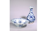 A BLUE AND WHITE 'LOTUS' VASE AND DISH